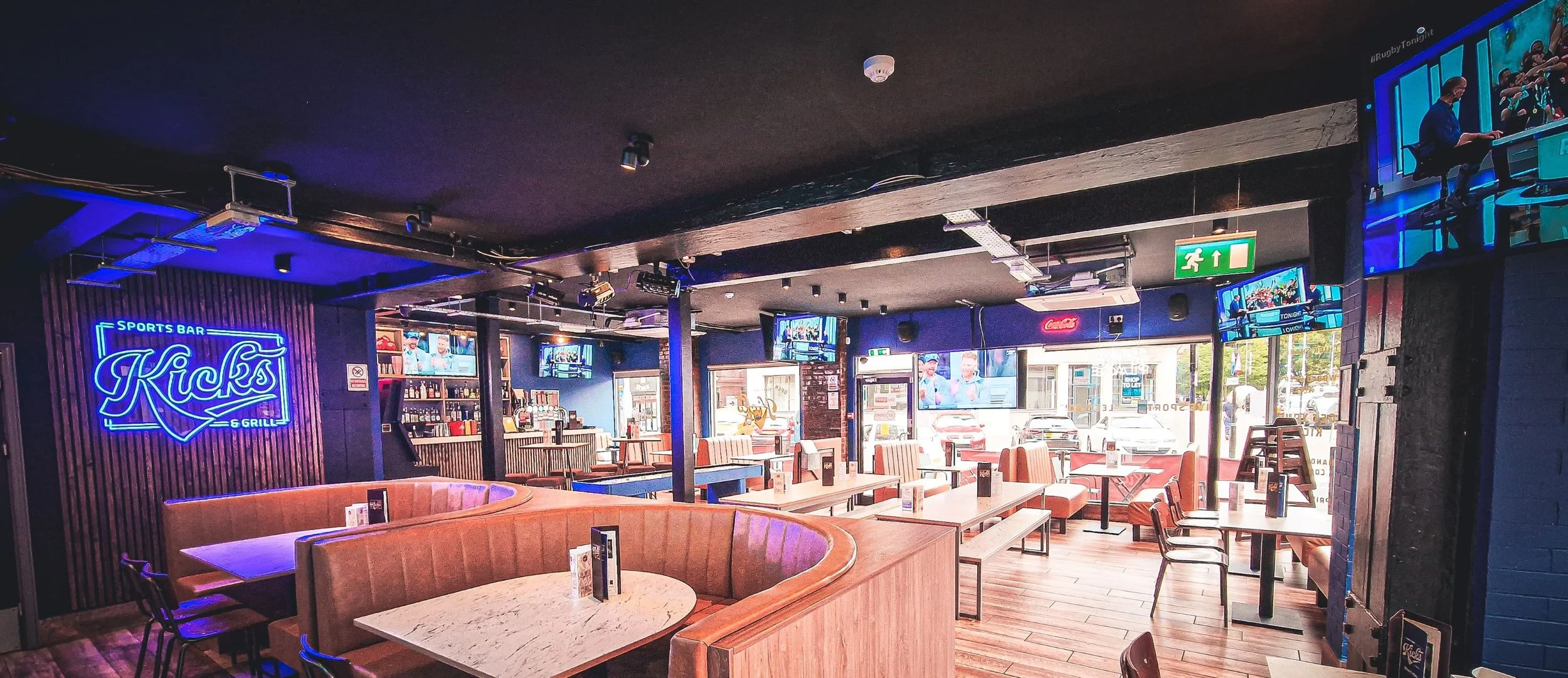 Originally a diner in the centre of Hull, Kicks was transformed into a sports bar, turning it from a food-only venue into one able to attract trade in multiple ways and extend trading well beyond standard dining hours. Its large front windows gave the venue excellent visibility from the street, but also created a challenge for AV due to high daylight levels.